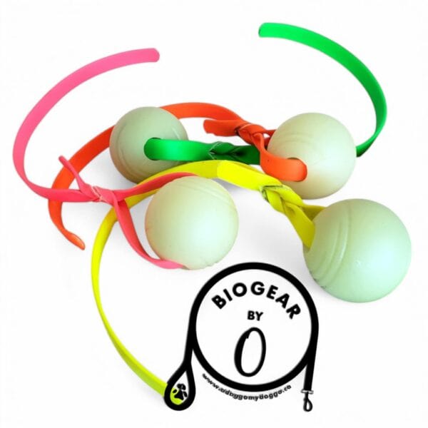 The balls are available in ONE colour. They look kind of ghostly white by day, but glowwww by night! Strap colours are bright and visible in case your dog loses it in the tall grass! If you have a colour combo preference, please Contact Us!